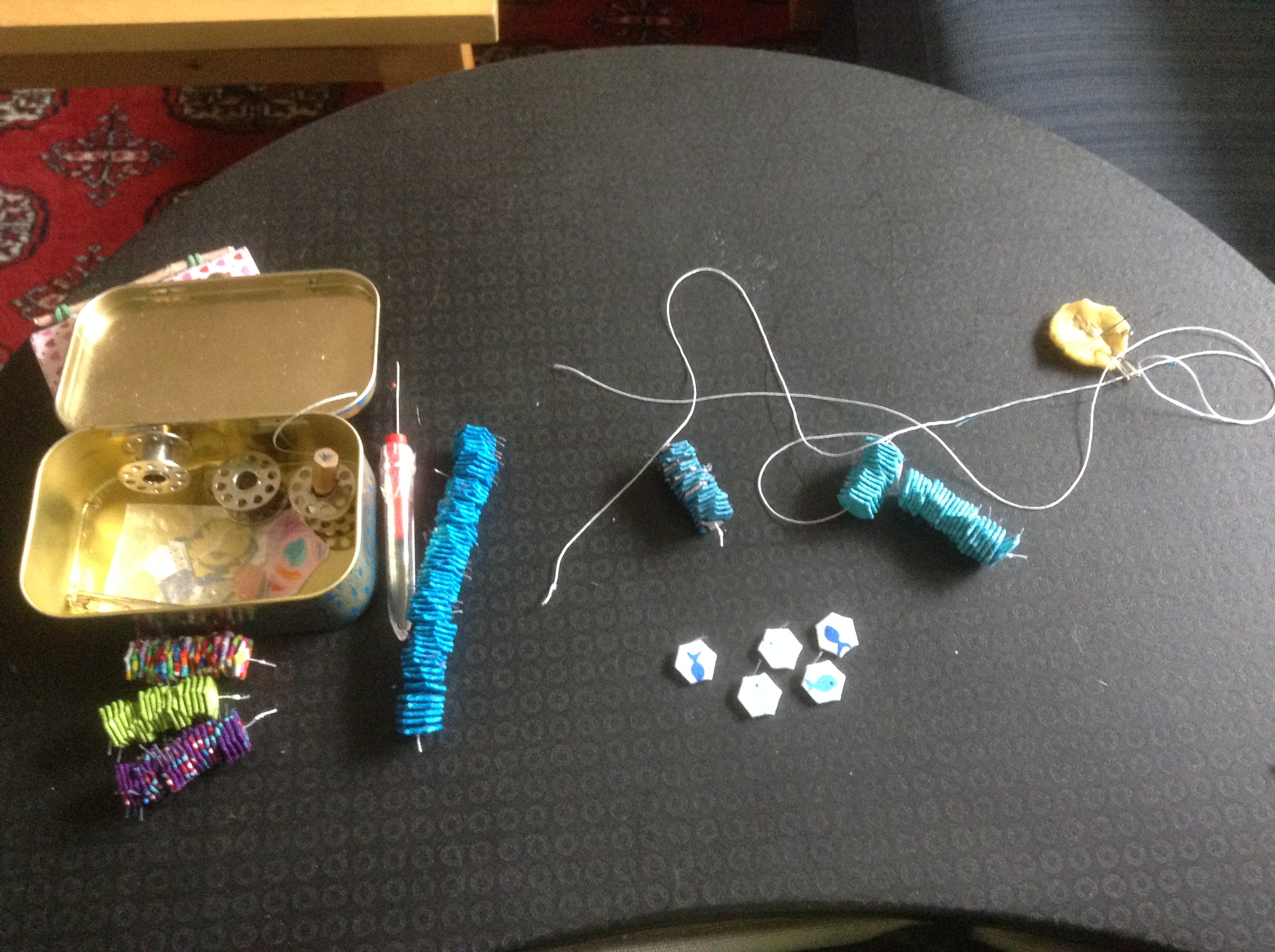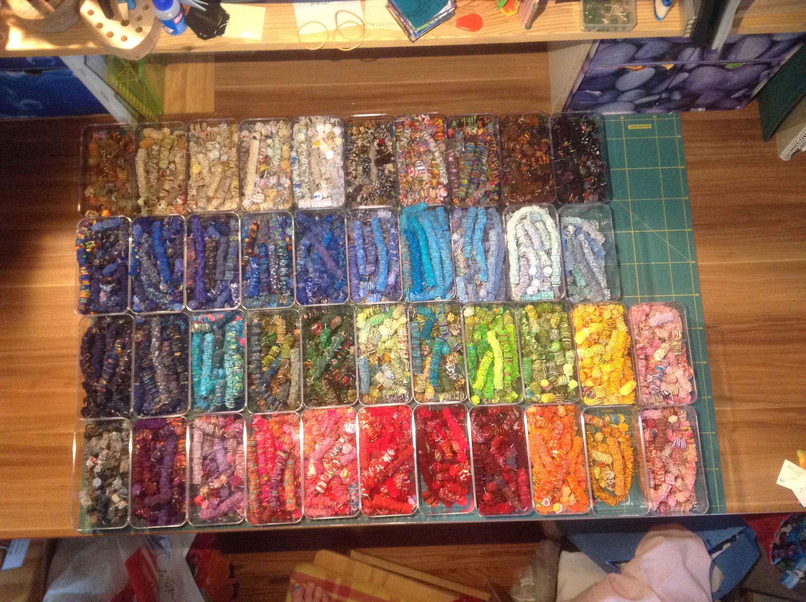 50.000 Hexies strung up and sorted by colours. And a certificate and a medal from my daughter, on reaching the goal.