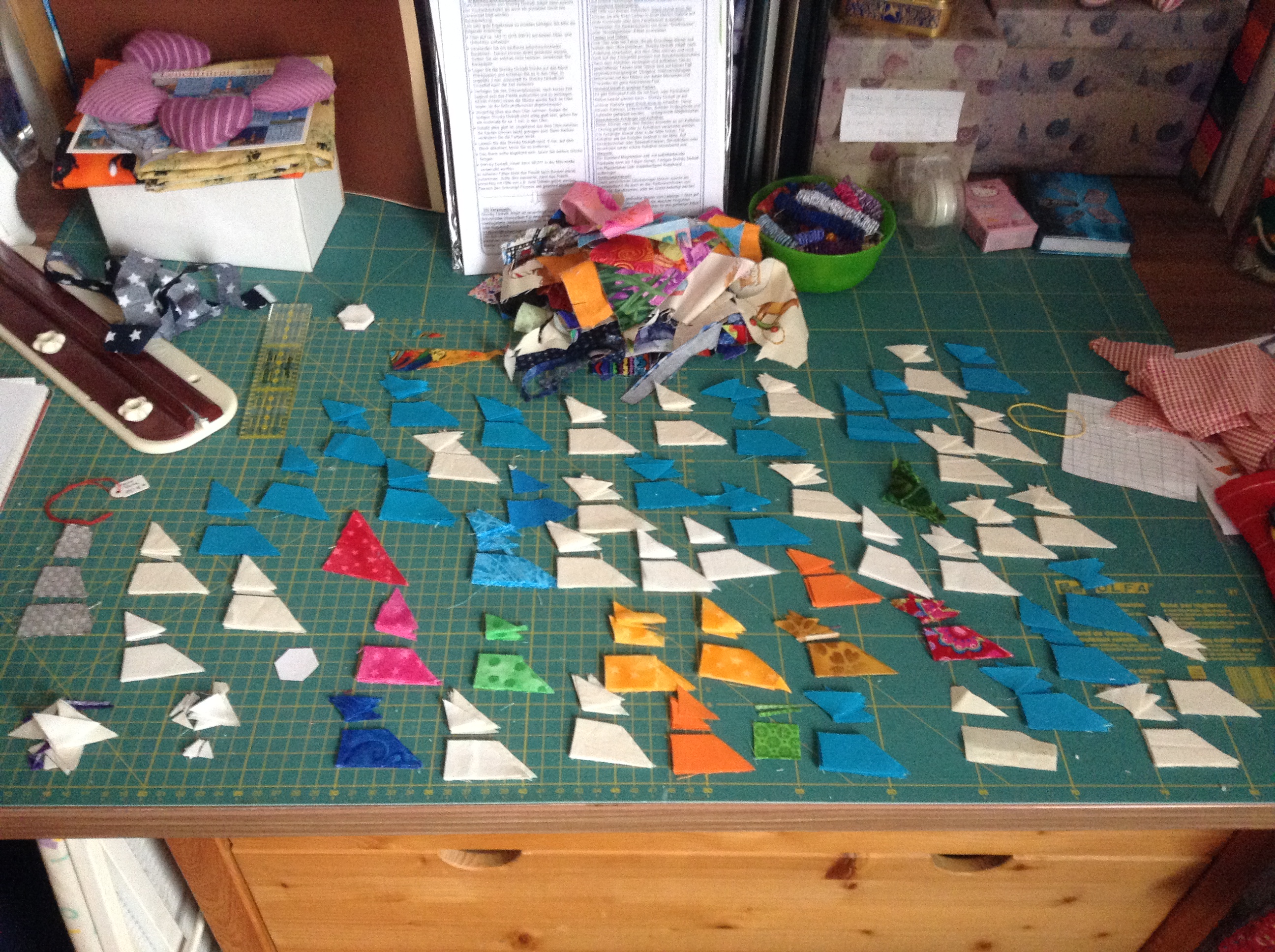 Und dann wurde natürlich gescherzt. Und die Frage kam auf, was ich mit diesen winzigen Teilchen vorhätte. Ein Puppenquilt? Oder doch etwas größeres? Und die Herausforderung war geboren. Es wird ein Quilt für ein Doppelbett.