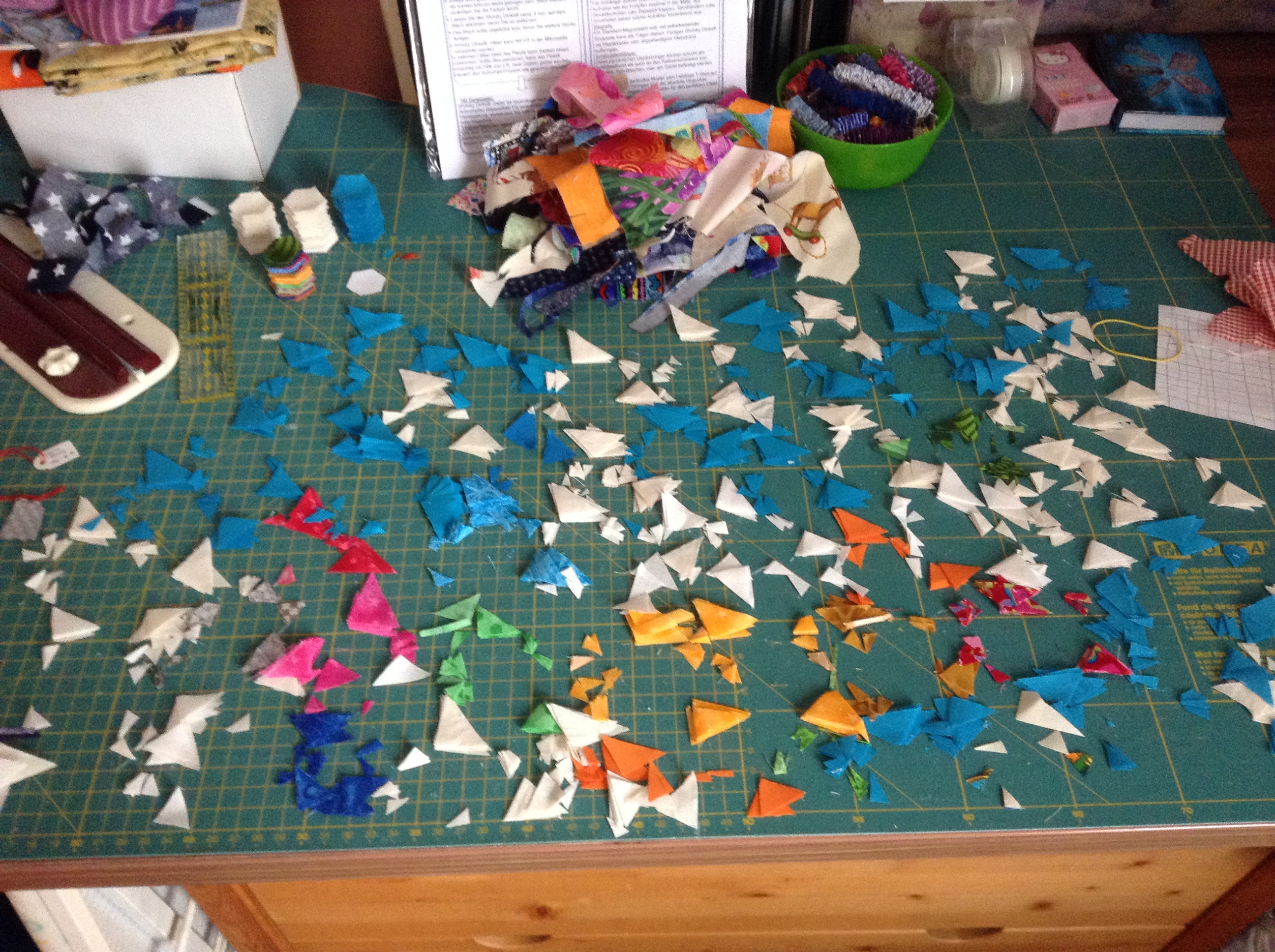…..mit Rollschneider, Lineal und anderer Schere, Stoff verschnippselt habe….