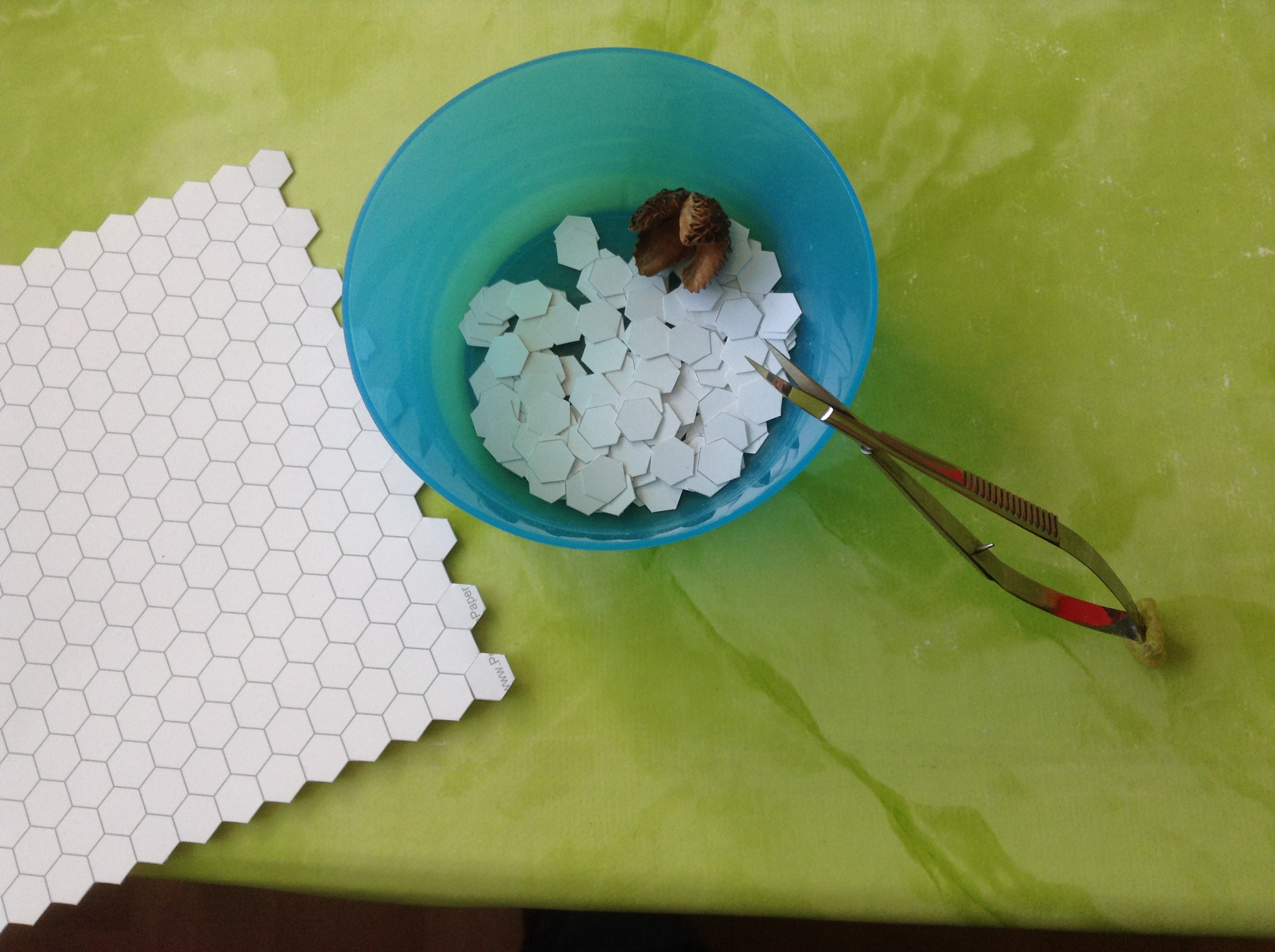 …Stunde um Stunde Stoff und Papier zu 1/4 inch Sechsecken verarbeitete….