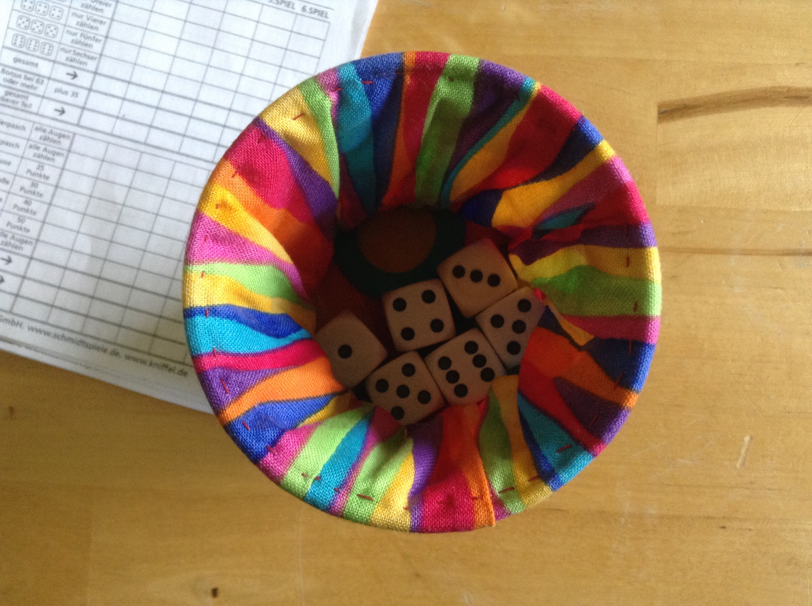 Mein erster Behälter wurde allerdings etwas zu groß, deswegen passen dort locker sechs Würfel rein, und jetzt ist es ein Würfelbecher für unterwegs. 😀