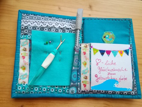 Weil sie viel häkelt habe ich einen Streifen Spitze aufgenäht, damit sie Maschenmarkierer einstecken kann. Einen Nahttrenner kann jeder brauchen, Platz um Sachen reinzustecken kann man auch nie genug haben. Und natürlich ein paar Nadeln….