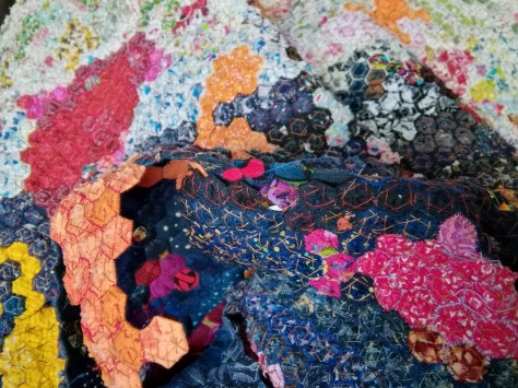 My original plan was to be done combining all single hexies into 32 tiles by September 9th 2018. After that I wanted to depaper the tiles and combine them to four rows and these to the whole top. But because I wanted to work on my masterpiece while going away on holidays, and because the cork tiles with the pinned single hexies were so awkward to pack up for travelling, I took the first eight finished fabrictiles with me and depapered on tour and the campgrounds in the Netherlands. I told that story here. This year in January I combined the next eight tiles – whoever wants to know about that can read here – after that I used every minute I was away from home to depaper every finished tile and combine them. (There was a short panic at house Meerbedeckt, here’s the post about it.) All in all the depapering and combining the tiles went quite fast and schwuppdich – the top is done.
