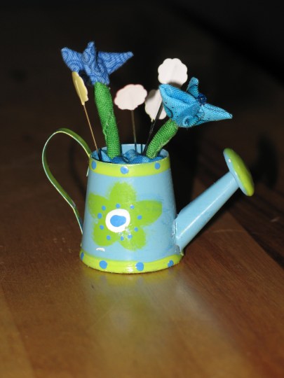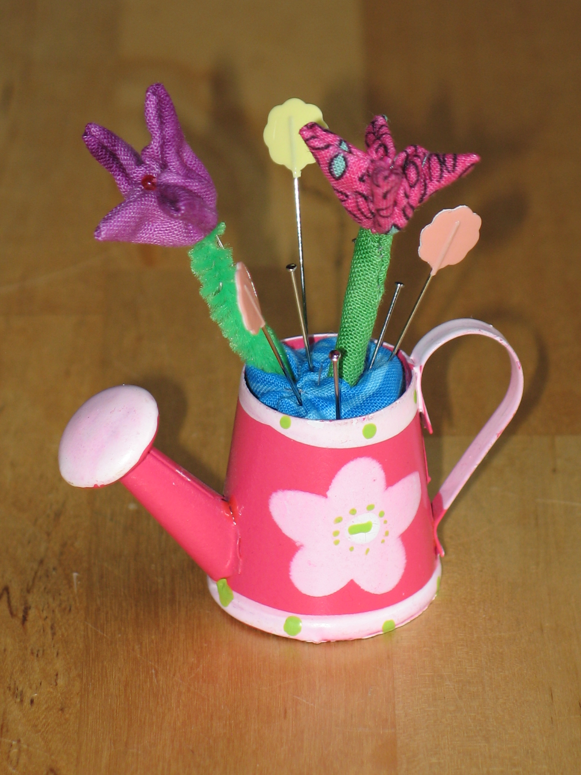Auf einer Messe fanden wir diese niedlichen Gießkannen. Anjas Idee war es, diese als Nadelkissen zu benutzen. Die Minitulpen stammen aus einem Japanischen Patchworkbuch.