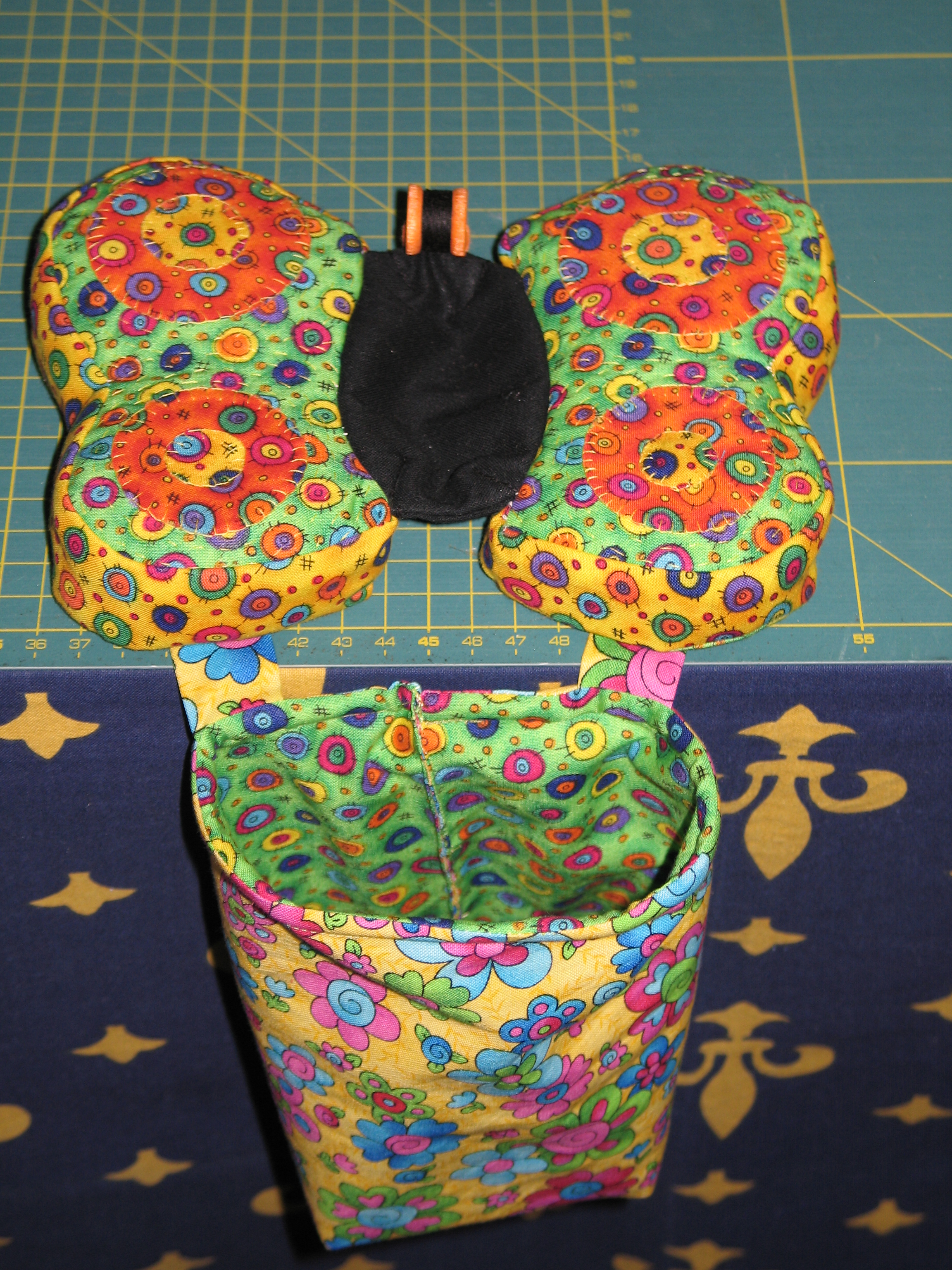 Das Schmetterlingsnadelkissen mit Fadenbeutel ist nach einem Eigenentwurf genäht und hilft mir fleißig an meiner Nähmaschine.