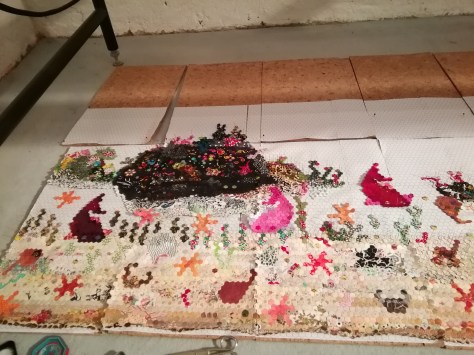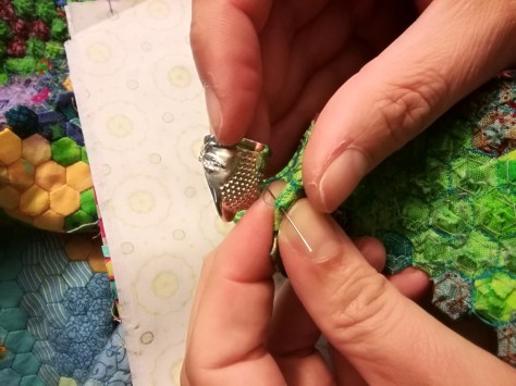 My original plan was to be done combining all single hexies into 32 tiles by September 9th 2018. After that I wanted to depaper the tiles and combine them to four rows and these to the whole top. But because I wanted to work on my masterpiece while going away on holidays, and because the cork tiles with the pinned single hexies were so awkward to pack up for travelling, I took the first eight finished fabrictiles with me and depapered on tour and the campgrounds in the Netherlands. I told that story here. This year in January I combined the next eight tiles – whoever wants to know about that can read here – after that I used every minute I was away from home to depaper every finished tile and combine them. (There was a short panic at house Meerbedeckt, here’s the post about it.) All in all the depapering and combining the tiles went quite fast and schwuppdich – the top is done.