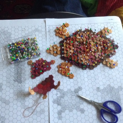 ….spending hours and hours basting paper and fabric to 1/4 inch hexies….