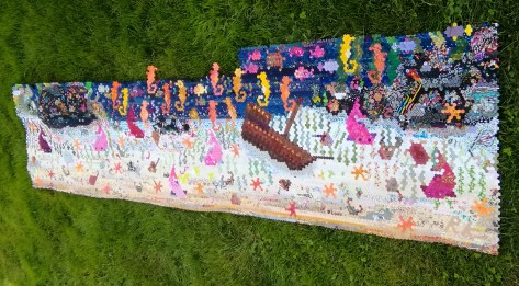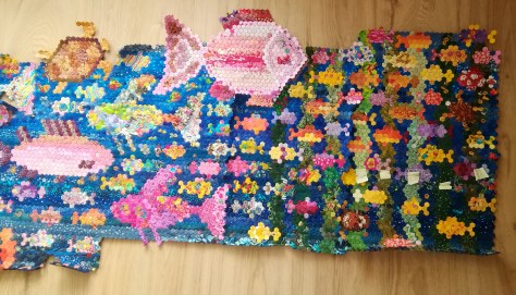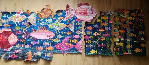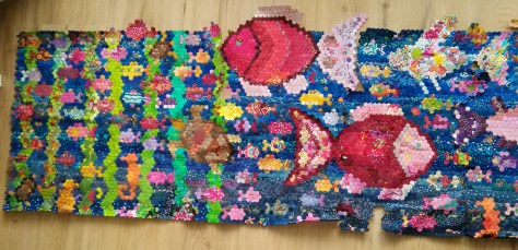 Weil ich jetzt die ganzen schon fertig zusammen genähten Fische ins Wasser setze, dauert das nähen meiner festgesetzten 60 Sechsecke pro Tag um einiges länger als noch beim Meeresgrund, da musste ich nur einzelne Teilchen aneinander fügen. Dafür sieht man den Erfolg aber auch schneller.