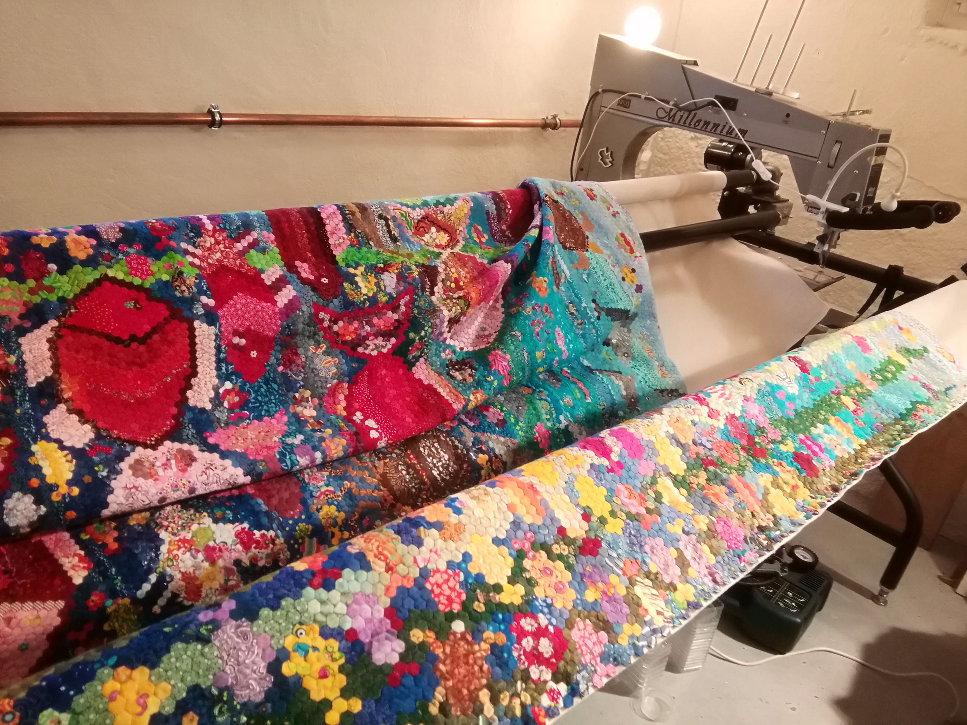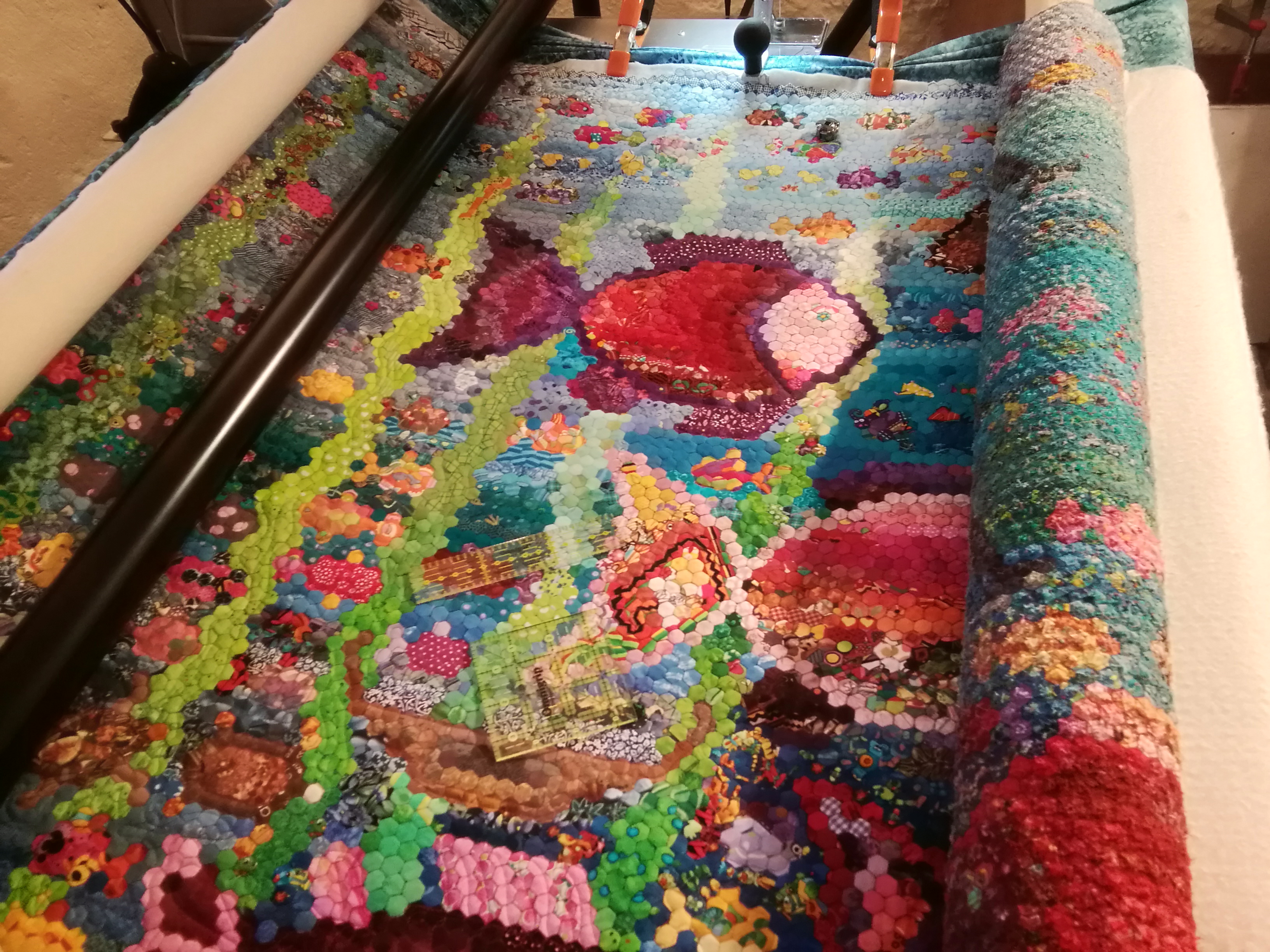Trotz oder wegen ständigem Farbwechsel und stop and go habe ich 17,5 Stunden gequiltet.